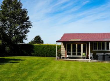 A self-contained one-bedroom sleepout with corrugated iron cladding and roof, kitchenette, shower, toilet plus vanity, gas hot water and covered north facing concrete deck in private setting.